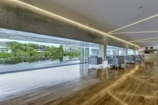 The exterior has a simple and understated style. It's a work by the master architect Tadao Ando.