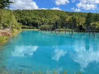 The pond is formed by spring water rich in aluminum hydroxide from the upstream Shirogane Onsen area mixing with the Biei River.
