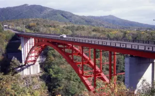 There's a parking lot and an observation deck by the bridge. In autumn, the mountains are covered in red maple leaves—the view is breathtaking! Definitely worth stopping by to take it all in.