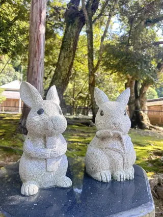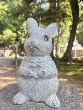境内には約50体ものさまざまな石うさぎがあり、遊んでいるものや祈っているものなど、表情豊かで愛らしいです。言い伝えでは、うさぎは恩返しとして大国主命と八上姫の良縁を結んだとされ、そのため出雲大社では「良縁」をもたらす象徴、縁結びの使者とされています。