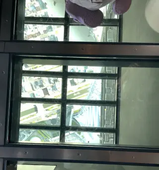 ガラス床では、足元に地上350mの景色が広がるスリルを体験できる。