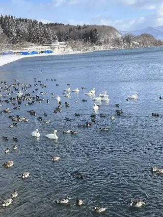 冬になると、「猪苗代湖」にはシベリアから3000羽ほどの白鳥がやって来る。