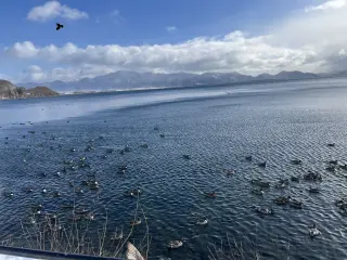 白鳥としぶき氷が見どころの「冬の猪苗代湖」