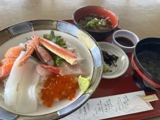 イカやホタテなどの浜焼きと、イカスミ味の珍しいソフトクリームが名物。