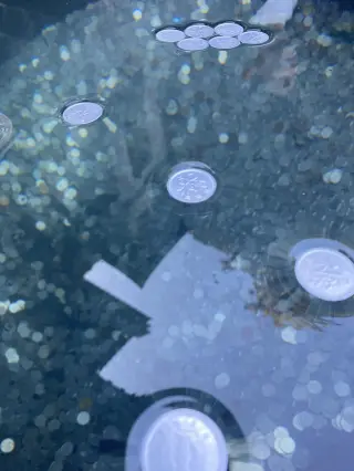 目の前にある大きな水がめでは、一円玉が浮かぶと願いが叶うと言われているので挑戦しよう。