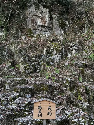 ややわかりづらいが、断崖の左上側にある天狗とカラス天狗の彫物も見どころのひとつだ。