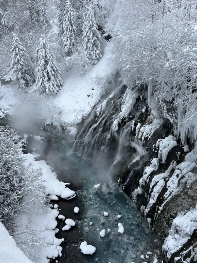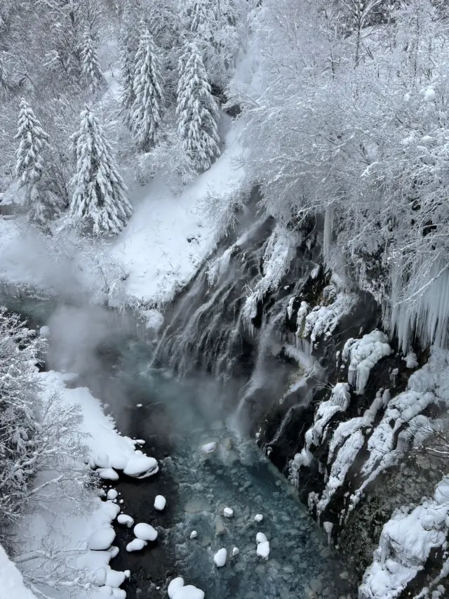 十勝岳から流れ出した水に含まれる火山ならではの成分が光の反射に影響を与え、水面がコバルトブルーに輝く美瑛川に白い滝がしぶきを上げて注ぎ込む様子は迫力満点。草木の緑がまぶしい夏、木々の葉が紅葉する秋など、周囲の自然とともに変化する景観はどの季節も見ごたえあり。黒い岩肌に滝の流れと雪の白が映える冬の眺めは特に壮観だ。
