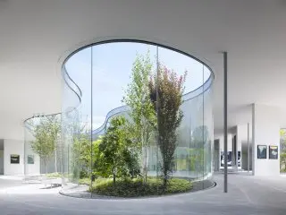 • 自然と調和したシンプルで禅を感じる美術館。館内には千住博の大きな滝の絵が展示されていて、自然光が作品を引き立て、静かな雰囲気が広がっています。アートと自然が見事に融合した場所です。
