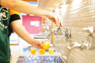 店先に今日提供しているみかんの品種の写真が置いてあります。みかんジュースの種類がとても多いので、酸味・甘み・ほろ苦さなど、好みの味わいをしっかり確認して選ぶのがおすすめです。
