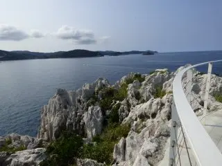 海岸的岩石颜色很特别,在日本的海域很少见。站在观景台上,海天一色,非常美丽!