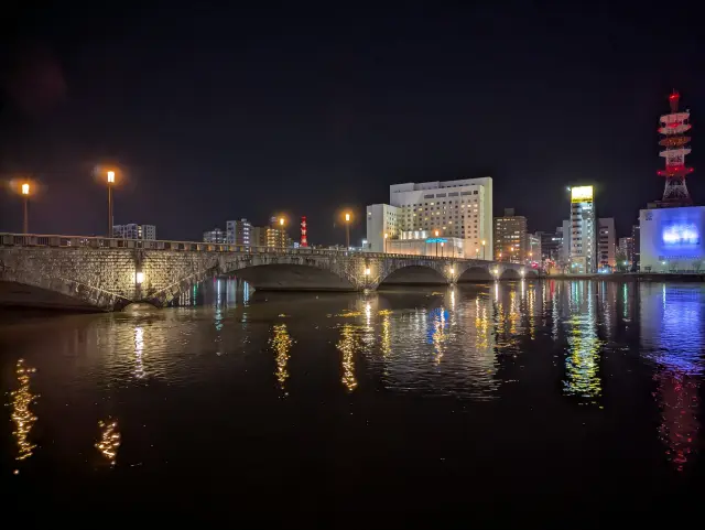 晚上吃饱喝足后散步到信浓川畔, 灯光映照下的万代桥, 展现出和白天截然不同的氛围。