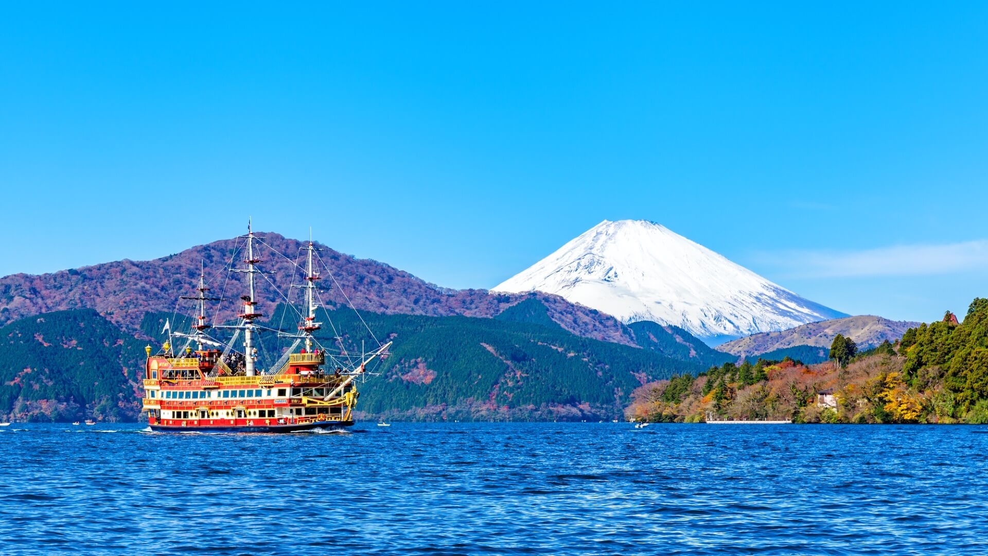 箱根火山的火山口湖景色优美,观光设施完善。