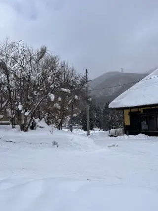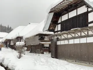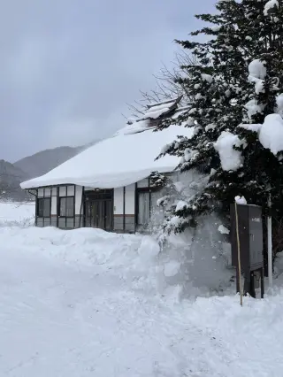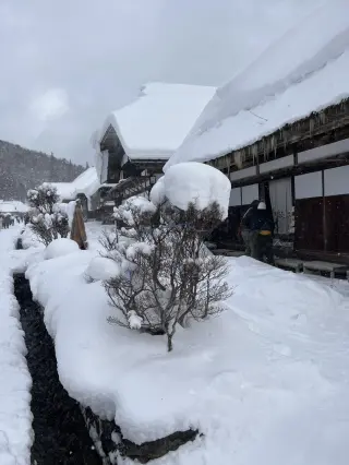 冬季時茅葺建築古民家周遭是一片白雪覆蓋的銀白世界。