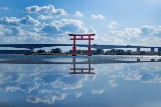 喜歡攝影的一定會拍到停不下來,鳥居搭配遠方的橋樑與夕陽,畫面超級詩意。