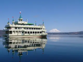 從船上看洞爺湖四周的山和天空,好像一幅會動的水彩畫,很喜歡這種慢節奏的湖上散步,超放鬆~