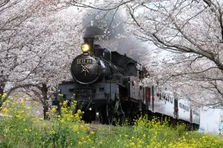 櫻花樹就種在鐵軌旁邊,在看過去就是油菜花田,想同時賞櫻花和油菜花搭乘鐵道遊覽是好方法。