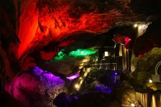 燈光打在鐘乳石上五彩繽紛還挺好看的,要注意地上潮濕的環境。