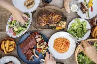 用炭火劈哩啪啦地燒烤肉塊、披薩和鮮嫩蔬菜,體驗自行調理的樂趣