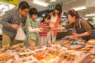 這有各種新鮮海鮮~還有培育的農產品蔬菜等。此外~餐廳還有提供像食材的漁民料理和農家料理哦~