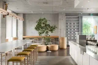 位在表參道靜謐的青山巷弄內~店內水泥牆搭配木質地板的設計~加上好幾片大片的落地窗~把窗外的綠意景緻延伸帶入室內